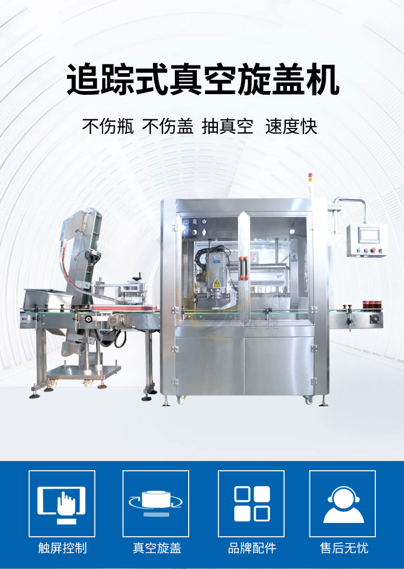 跟蹤式真空旋蓋機適用于多種瓶型的馬口鐵蓋真空旋蓋。設備由PLC結合觸摸屏控制,采用世界知名品牌電器和氣動元件,故障率低。