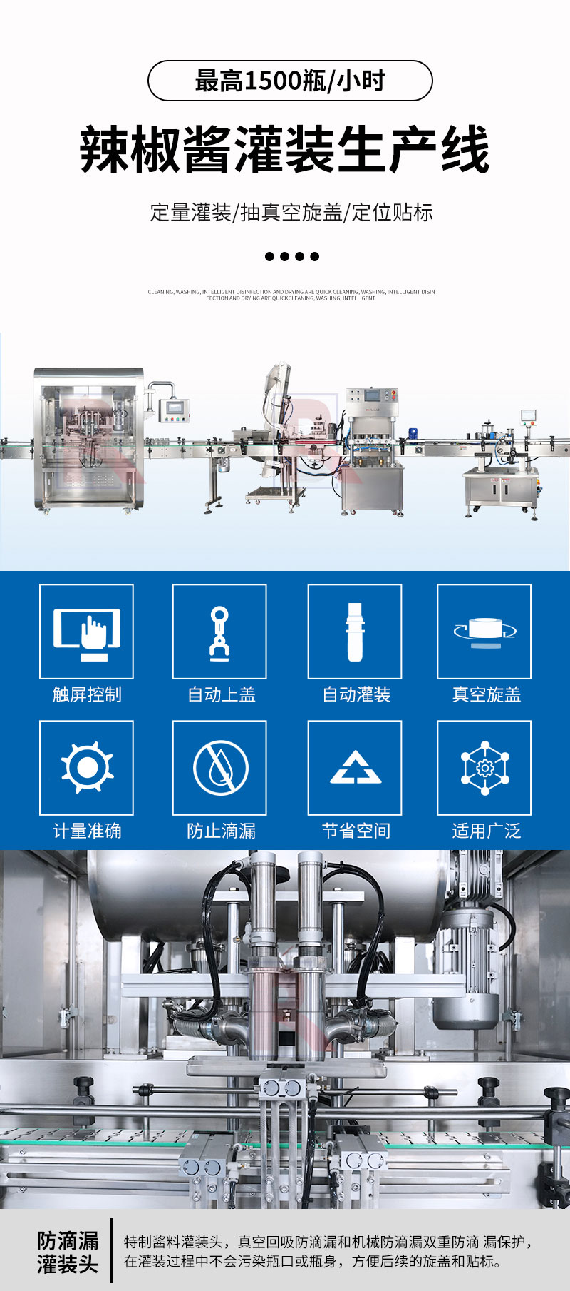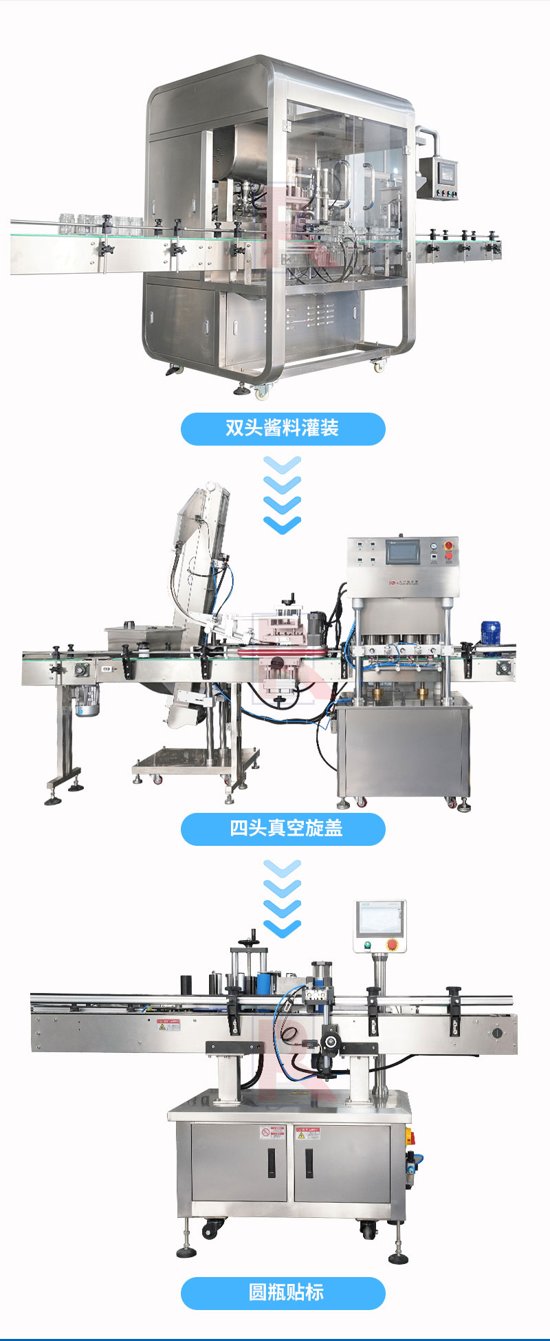 雙頭辣椒醬灌裝生產(chǎn)線適用于調(diào)味品中帶顆粒并且濃度較大的香菇醬、豆瓣醬、花生醬、芝麻醬、果醬、牛油火鍋底料等醬類(lèi)的灌裝。