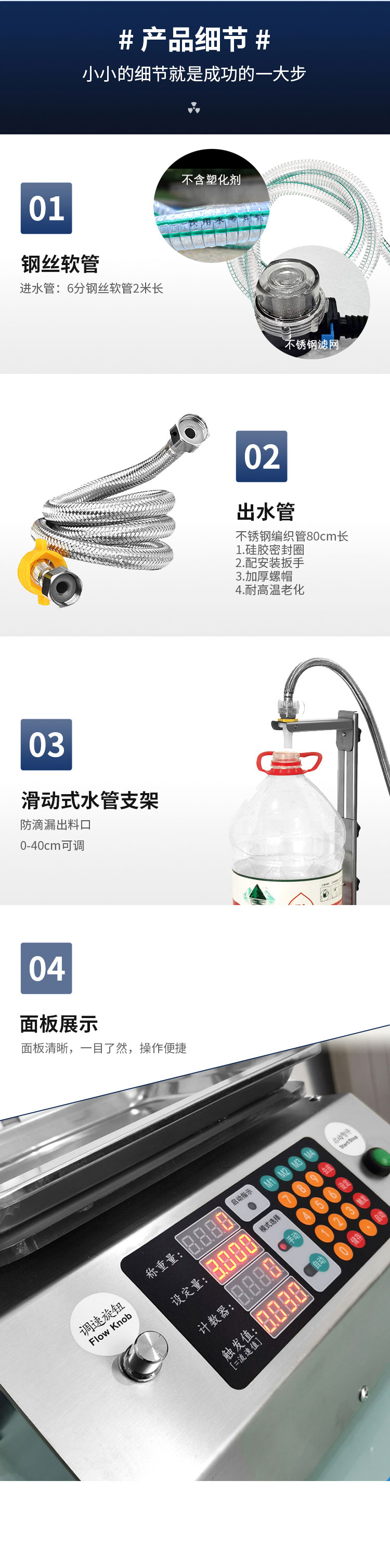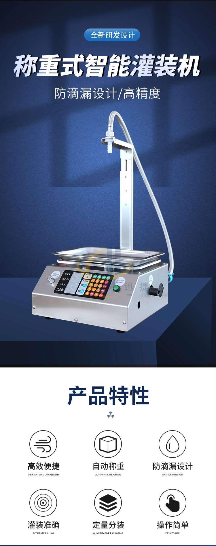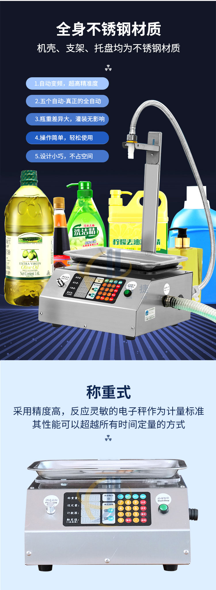 稱重式液體灌裝機(jī)適用于30g-15kg內(nèi)的各種常見液體灌裝。采用精度高,反應(yīng)靈敏的電子秤作為計(jì)量標(biāo)準(zhǔn)。其性能可以超越所有時(shí)間定量的方式。
