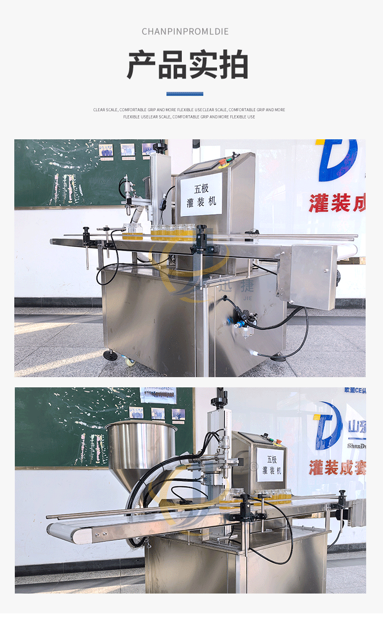 五極灌裝機:極快-單頭2200瓶/時 極簡-操作簡單 極廣-啥啥都能灌 極穩(wěn)-24小時不停機 極準-200g誤差小于1g。它可以和真空旋蓋機搭配使用。