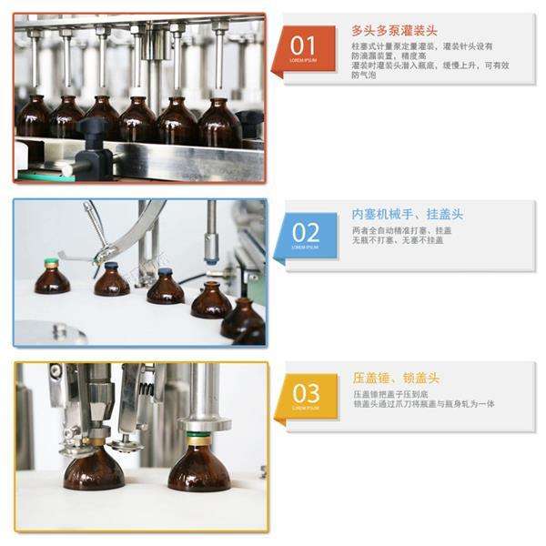 2. 穩(wěn)定精準(zhǔn)快速:柱塞式計量泵定量灌裝,灌裝針頭設(shè)有防滴漏裝置,精度高。每分鐘可灌裝40-60瓶。